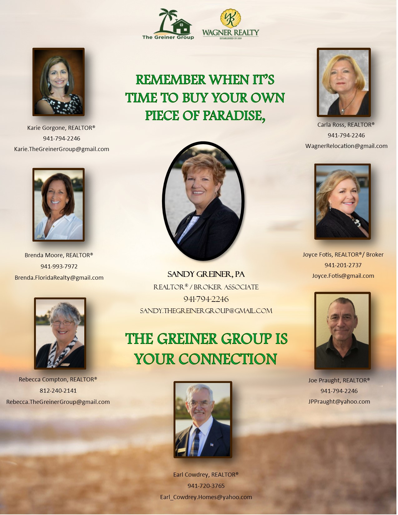 The Greiner Group at Wagner Realty has a number of Sales Agents who are qualified and at your service whenever you sell or buy property. We will be happy to walk you through the process of listing and selling your home. Our websites attract many buyers and sellers from all over the country, and even foreign lands! Today's market is so active, you need the advice of a knowledgeable agent who knows this area and the market better than anyone else. Let us be your guides.
